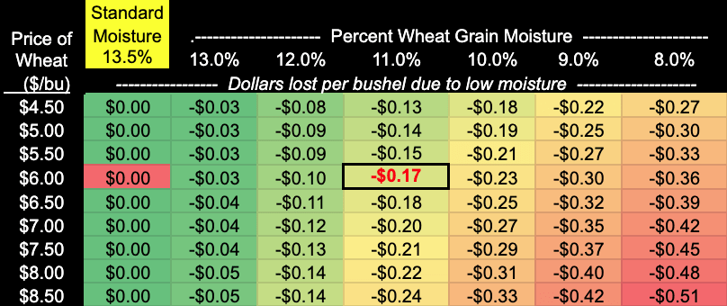 Weather, availability of harvest equipment, etc. will dictate when you can actually harvest wheat. No, you can’t hit 13.5% most of the time. But if by more timely harvest you can sell wheat at 12.0% moisture instead of 10.0% moisture, you preserve income. The difference is enough to factor in your harvest management decisions to put those savings in your pocket.
